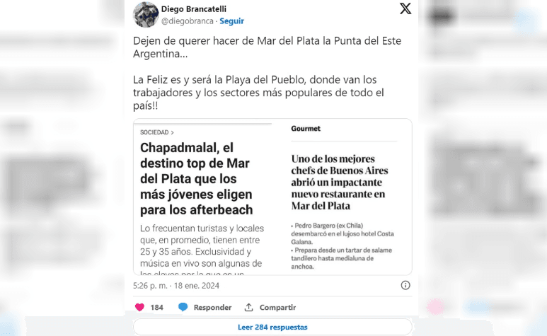 Al periodista le llamaron la atención dos titulares. “Chapamalal, el destino top de Mar del Plata que los más jóvenes eligen para los afterbeach” y “Uno de los mejores chefs de Buenos Aires abrió un impactante nuevo restaurante en Mar del Plata”. Entonces dejó su opinión en la red social X y generó repudio en las redes sociales: “Dejen de querer hacer de Mar del Plata la Punta del Este Argentina… La Feliz es y será la Playa del Pueblo, donde van los trabajadores y los sectores más populares del país”.