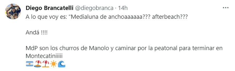 “A lo que voy es: “¿Medialuna de anchoa?, ¿afterbeach? Andá. Mar del Plata son los churros de Manolo y caminar por la peatonal para terminar en Montecatini”, agregó el periodista.
