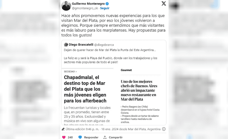También le respondieron desde el gobierno. El intendente del partido de General Pueyrredón, Guillermo Montenegro, le explicó que “hace años promovemos nuevas experiencias para los que visitan Mar del Plata, por eso los jóvenes volvieron a elegirnos. Porque siempre entendimos que más visitantes es más laburo para los marplatenses. Hay propuestas para todos los gustos”.
