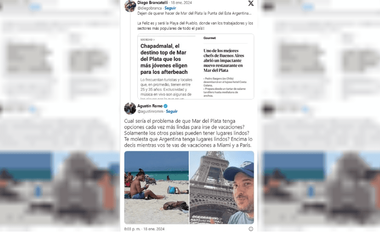 Mientras que el diputado de La Libertad Avanza (LLA) Agustín Romo manifestó que “¿Cual sería el problema de que Mar del Plata tenga opciones cada vez más lindas para irse de vacaciones? ¿Solamente los otros países pueden tener lugares lindos? ¿Te molesta que la Argentina tenga lugares lindos? Encima lo decís mientras vos te vas de vacaciones a Miami y a Paris”. El mensaje lo publicó acompañado de dos imágenes de Diego Brancatelli en sus vacaciones en Miami y en París.