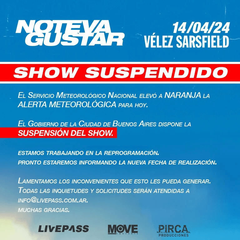 “Show suspendido. El Servicio Meteorológico Nacional elevó a Naranja la alerta meteorológica para hoy. El Gobierno de la Ciudad de Buenos Aires dispone la suspensión del show”, relataba el comunicado de la banda que explicaba la situación. Al mismo tiempo, la carta se refería a la fecha de reprogramación: “Estamos trabajando en la reprogramación. Pronto estaremos informando la nueva fecha de realización. Lamentamos los inconvenientes que esto les pueda generar. Todas las inquietudes y solicitudes serán atendidas a info@livepass.com.ar. Muchas gracias”.