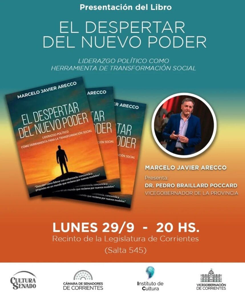 El próximo lunes 29 de septiembre a las 20 horas se presentará el libro “El despertar del nuevo poder. Liderazgo político como herramienta de transformación social” de Marcelo Javier Arecco. La presentación estará a cargo del Vicegobernador Pedro Braillard Poccard y se hará en el recinto del palacio legislativo. El evento es coordinado por la Dirección de Asuntos Culturales del Senado.