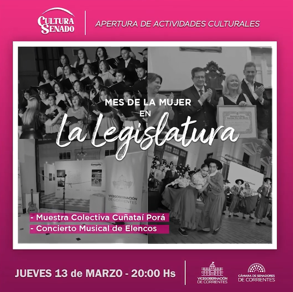 El próximo jueves 13 de marzo, a las 20, se dará inicio a las Actividades Culturales del Senado con un evento en las Escalinatas de la Legislatura provincial. En esta ocasión, quedará inaugurada la muestra colectiva “Cuñataí Porá”, que podrá visitarse en el Salón de los Pasos Perdidos.