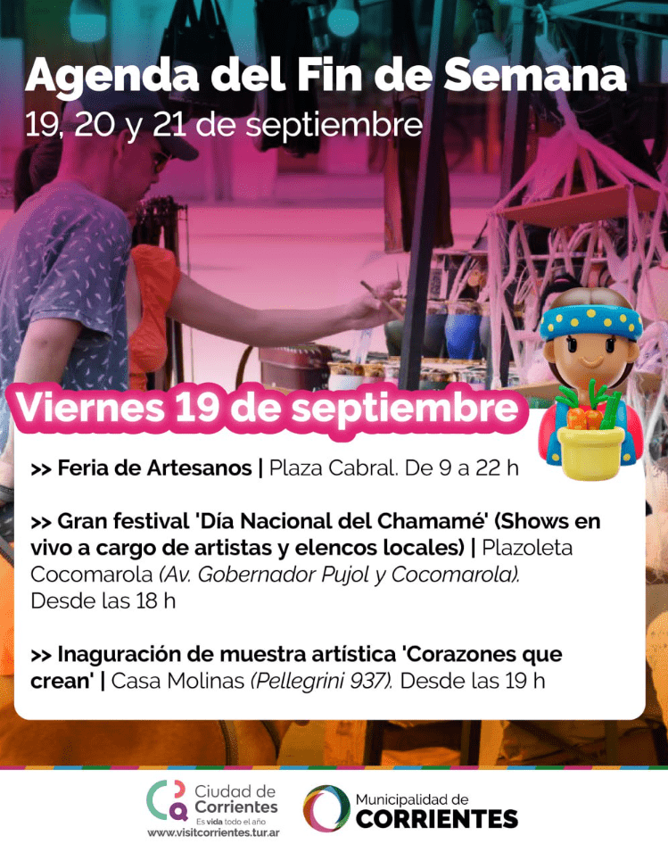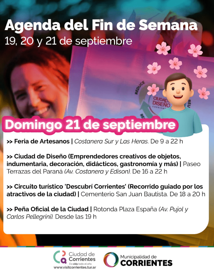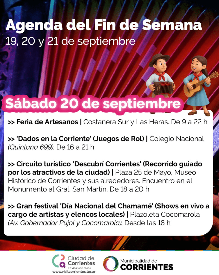Como cada fin de semana, desde la Municipalidad de Corrientes se propone un amplio abanico de ofertas culturales y de esparcimiento para locales y turistas. Entre las alternativas habrá actividades por el Día Nacional del Chamamé, Ciudad Diseño, recorridas pedestres, entre otras. Todas las propuestas son totalmente gratuitas y abiertas a todo público.