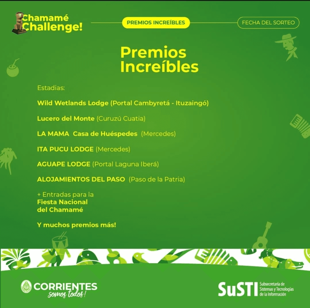 Chamamé Challenge ofrece una variedad de premios para los participantes, incluyendo hospedajes exclusivos en destinos icónicos de la provincia como Cambyretá, Ituzaingó y Paso de la Patria.
