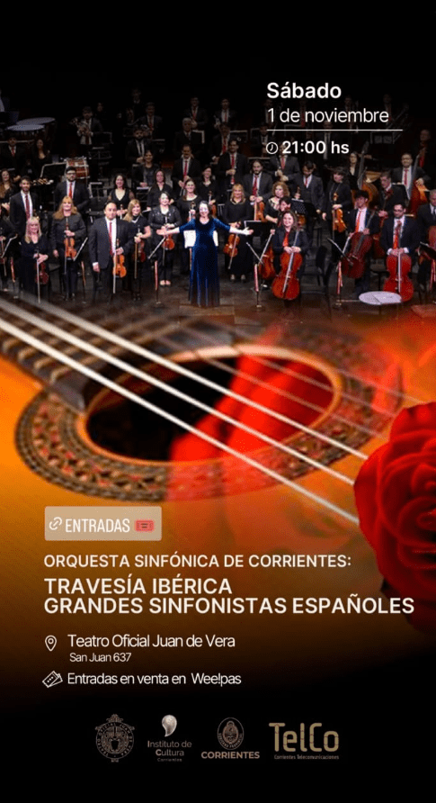La Orquesta Sinfónica de Corrientes regresa al Teatro Oficial Juan de Vera para ofrecer un espectáculo de música española. Guitarra, castañuelas, polleras y tacos harán aparición para transportarnos a España, con sus ritmos y giros melódicos característicos.
