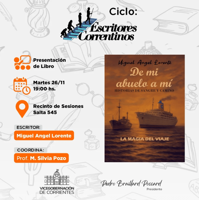 Miércoles 26 /11 presentación del libro “De mí abuelo a mí” del escritor correntino Miguel Angel Lorente.