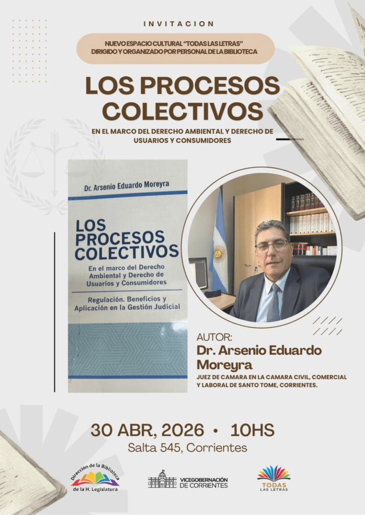 En el marco del reciente estrenado espacio cultural “Todas las Letras”, organizado por personal de la Biblioteca de la Honorable Legislatura, se llevará a cabo la presentación del libro “Los procesos colectivos. En el marco del Derecho Ambiental y Derecho de Usuarios y Consumidores”, del Dr. Arsenio Eduardo Moreyra.