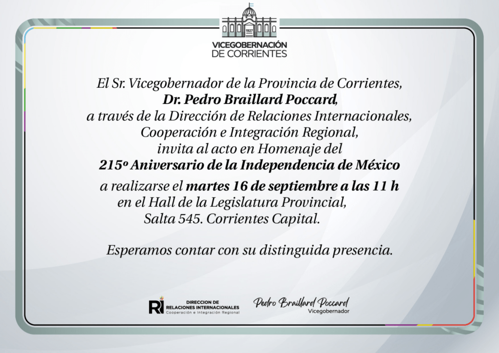 El vicegobernador de la provincia, Pedro Braillard Poccard, invita el martes a las 11, en el Hall de la Legislatura provincial al acto por el 215° aniversario de la independencia de México, celebración que se lleva a cabo en el marco del “Programa Luminarias”.