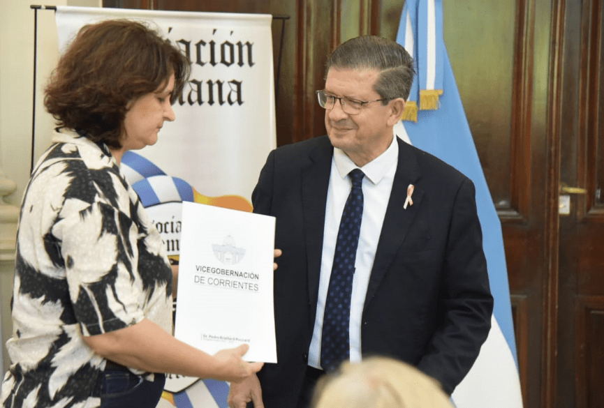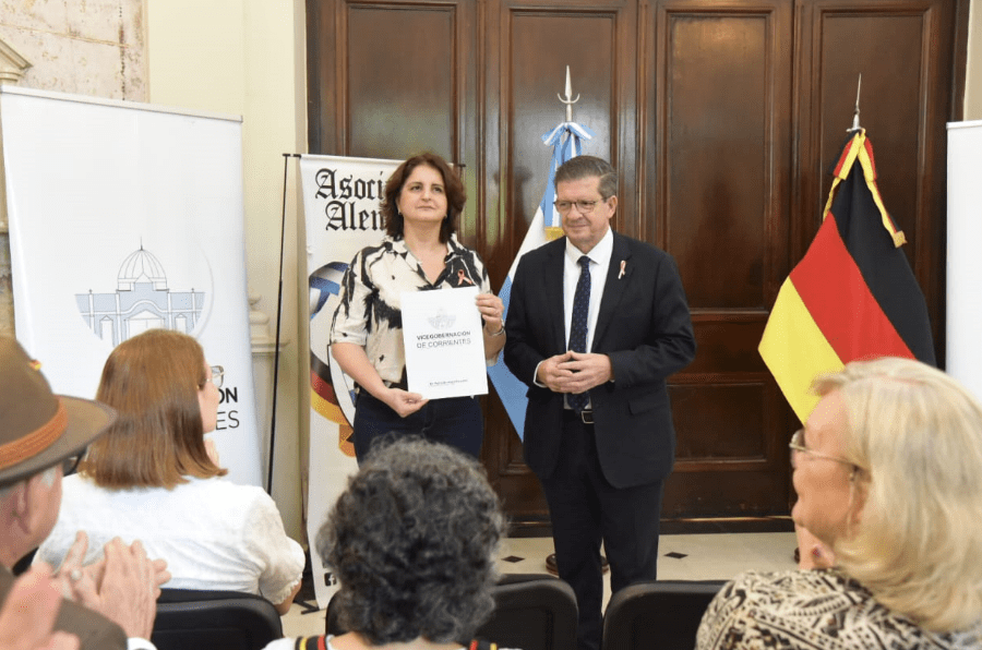 Como cierre del acto, el Vicegobernador hizo entrega de una declaración de Interés Legislativo a la Sra. Ana Luisa Goth, en reconocimiento a la labor de la Asociación Alemana en Corrientes.