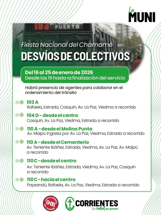 Con motivo de la realización de la Fiesta Nacional del Chamamé, se aplicarán desvíos en los recorridos de colectivos desde el jueves 16 hasta el sábado 25 de enero, con el objetivo de garantizar la seguridad y el ordenamiento del tránsito en la zona del evento.