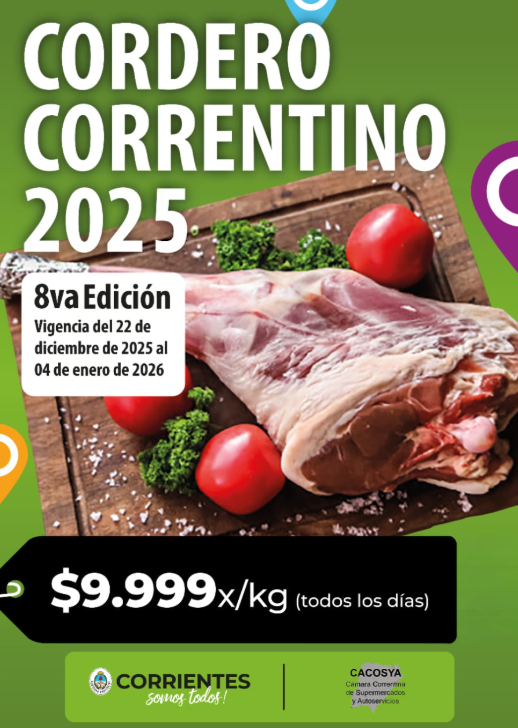 Con la implementación de la promoción del Cordero Correntino 2025, durante su vigencia y en los comercios adheridos, el precio del kilo es de $9.999, significando un ahorro de $3.000, un 23% menos con relación al costo en el mercado que es de $13.000.