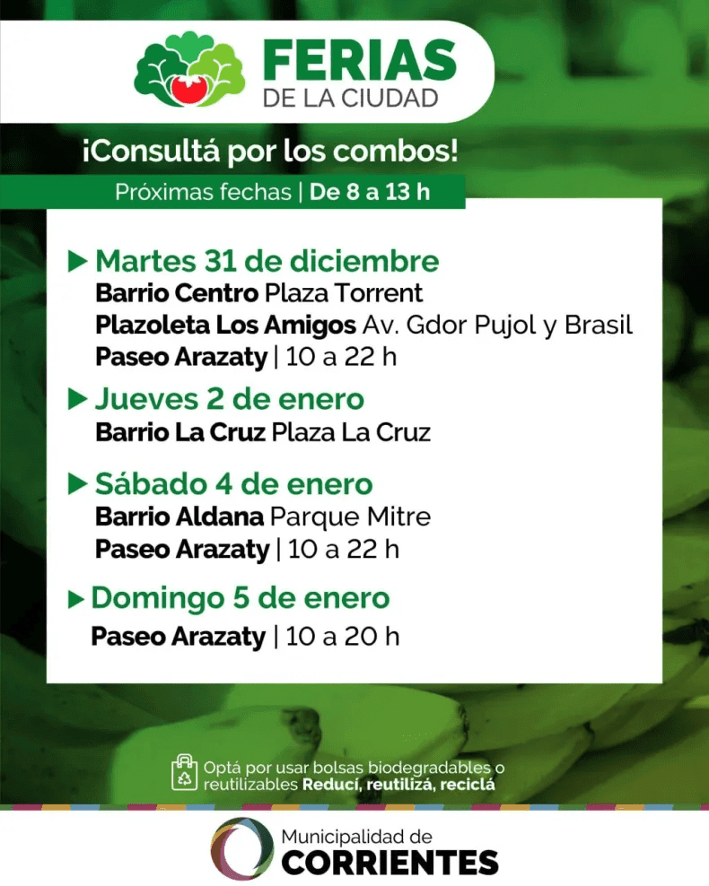 Iniciará el martes 24 de diciembre, ofreciendo productos para la mesa de Nochebuena. Los feriantes estarán en la esquina de San Lorenzo y Bolívar (plaza Torrent) y por Brasil, frente a la Escuela 6 (plazoleta Los Amigos) en el barrio Libertad. En esta oportunidad, como excepción, también se instalarán en el Paseo Arazaty, de 10 a 22.