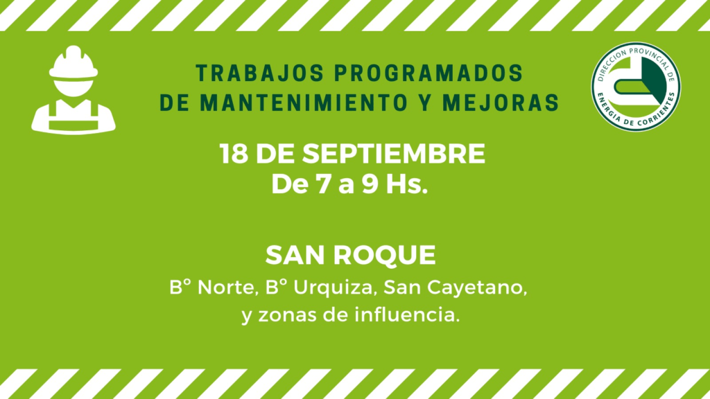 En San Roque, este jueves 18 de septiembre se realizará tareas de cambio de transformador en una Subestación Transformadora Aérea, por lo que el servicio se interrumpirá de 7 a 9 de la mañana, afectando a los barrios Norte, Urquiza, San Cayetano y zonas de influencia.