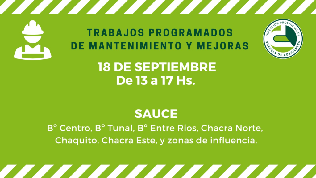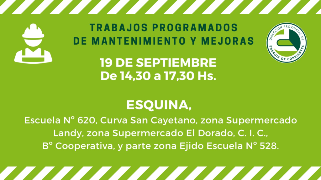 Por su parte, el viernes 19 de septiembre, la DPEC llevará adelante en Esquina el recambio de un poste de Línea de Media Tensión. La interrupción será de 14:30 a 17:30 horas y alcanzará a la Escuela N° 620, la Curva de San Cayetano, los supermercados “Landycar” y “El Dorado”, el C.I.C., el barrio Cooperativa, parte del Ejido (Escuela N° 528) y sectores cercanos.
