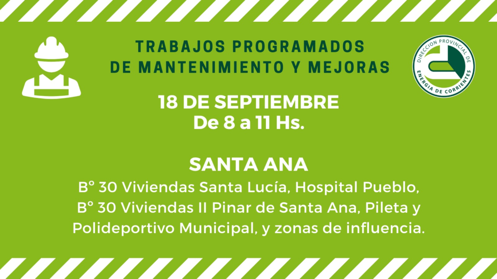 También el jueves, en Santa Ana, entre las 8 y las 11 de la mañana, se ejecutarán trabajos de mantenimiento en Líneas de Media Tensión. Las tareas alcanzarán a los barrios 30 Viviendas “Santa Lucía” y 30 Viviendas II “Pinar de Santa Ana”, además del hospital local, la pileta y el polideportivo municipal.
