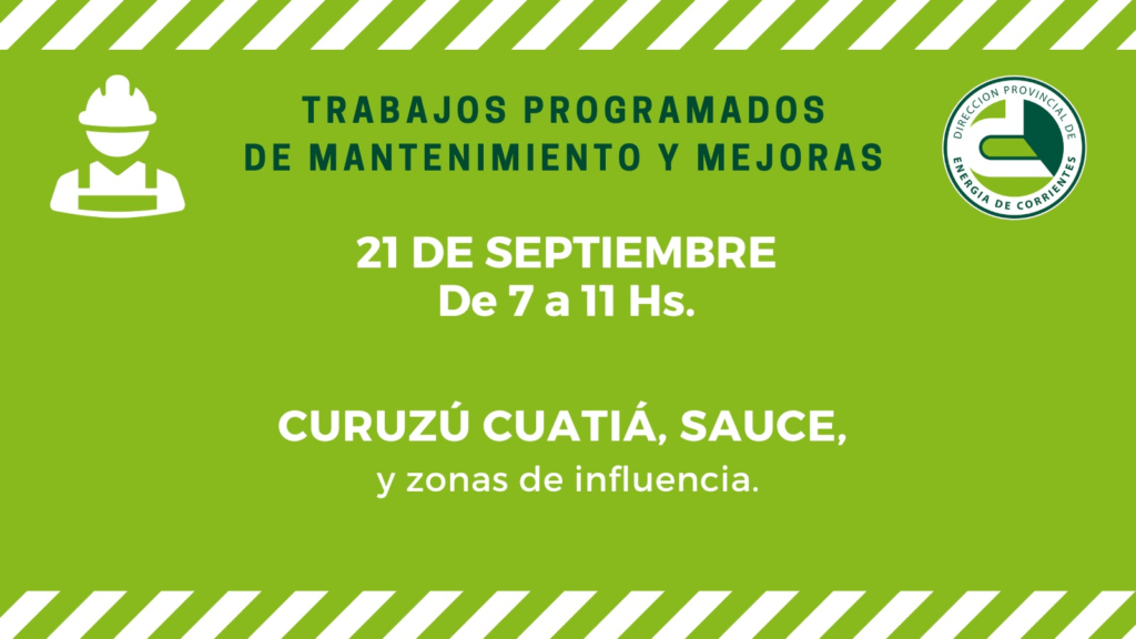 Finalmente, el domingo 21 de septiembre, en el horario de 7 a 11, se efectuarán trabajos de mantenimiento de equipos de Alta Tensión en Curuzú Cuatiá y Sauce, además de zonas de influencia.