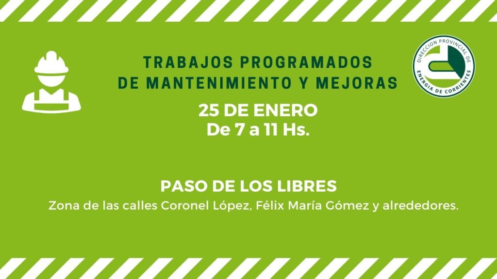 Además, en la ciudad de Corrientes, la DPEC informó que ejecutará trabajos de mantenimiento de LMT y por eso se suspenderá el servicio de 8 a 12 horas, en el barrio San Pablo y proximidades. Y por último, también por igual razón, se interrumpirá el suministro de energía en el horario de 7 a 11, en San Luis del Palmar.