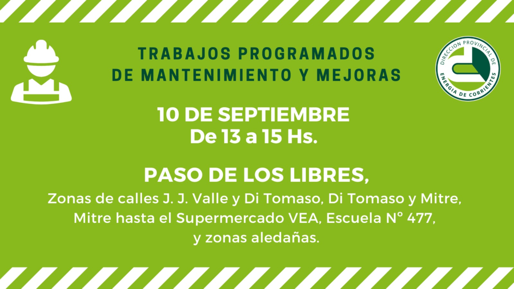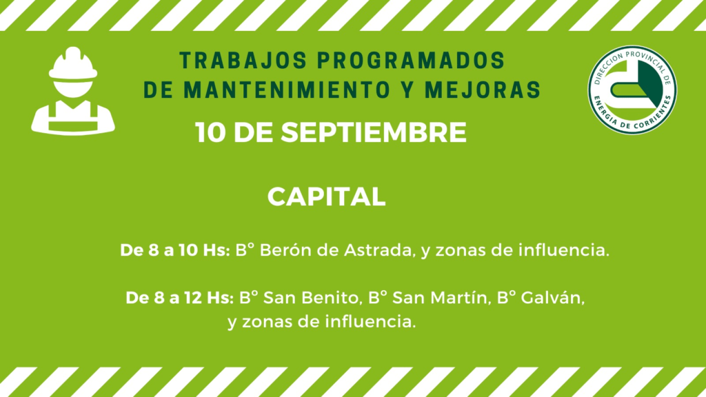 En Capital, se ejecutarán tareas de mantenimiento de líneas de media tensión, este miércoles 10 de 08 a 10, en el barrio Berón de Astrada; y de 08 a 12 en los barrios San Benito, San Martín, Galván, y zonas de influencia.