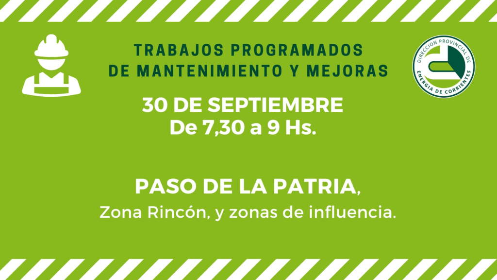 También en Paso de la Patria, se llevará a cabo mantenimiento de Líneas de Media Tensión, de 07:30 a 09:00 Hs, por el barrio Rincón, y zonas de influencia.