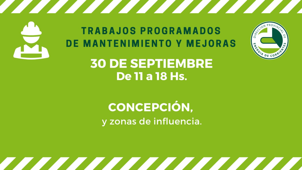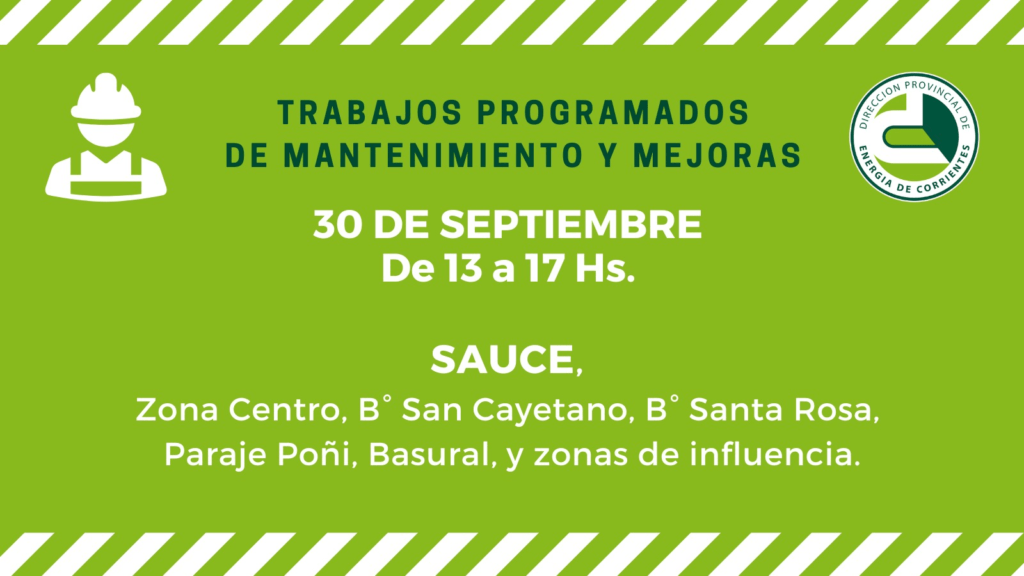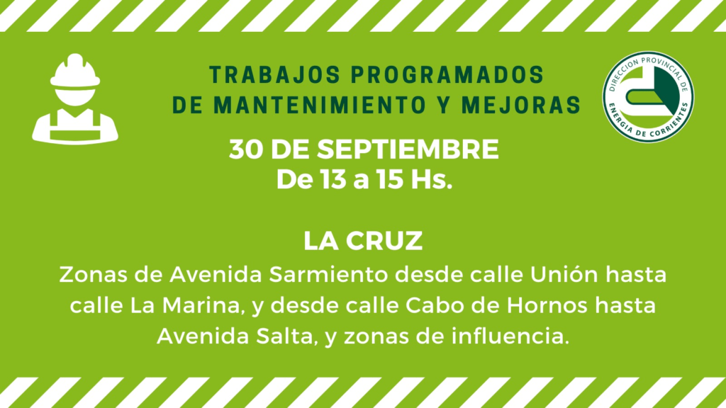 La Dirección Provincial de Energía de Corrientes (DPEC) informa que con motivo de realizar mejoras en el servicio, por lo cual se interrumpirá el suministro de energía eléctrica en las localidades de Esquina, Concepción, Sause, Santa Ana, La Cruz, Paso de la Patria, este martes 30 en sus respectivos horarios programados.