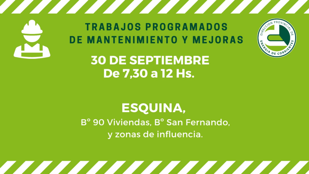De tal manera, en Esquina se ejecutarán tareas de tendido de nuevo Nexo de Media Tensión, de 07:30 a 12:00, en los barrios 90 Viviendas y San Fernando.