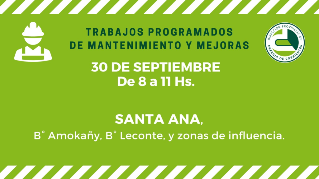 Mientras que en Santa Ana, harán mantenimiento de Líneas de Media Tensión, de 08:00 a 11:00 Hs, en los barrios Amokañy, Leconte y zonas de influencia.