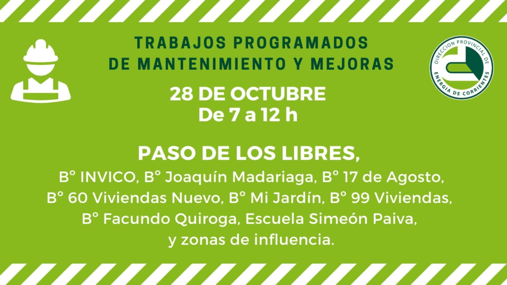 La Dirección Provincial de Energía de Corrientes (DPEC) informa que con motivo de realizar mejoras en el servicio, se ejecutarán tareas de tendido de conductores para alimentar una nueva Subestación Transformadora Aérea (SETA), por lo cual se interrumpirá el suministro de energía eléctrica en la localidad de Paso de los Libres, este martes 28 de 07:00 a 12:00, en los barrios de Invico, Joaquín Madariaga, 17 de Agosto, 60 Viviendas, 99 Viviendas, Mi Jardín, Facundo Quiroga, Escuela Simeón Paiva, y zonas de influencia.