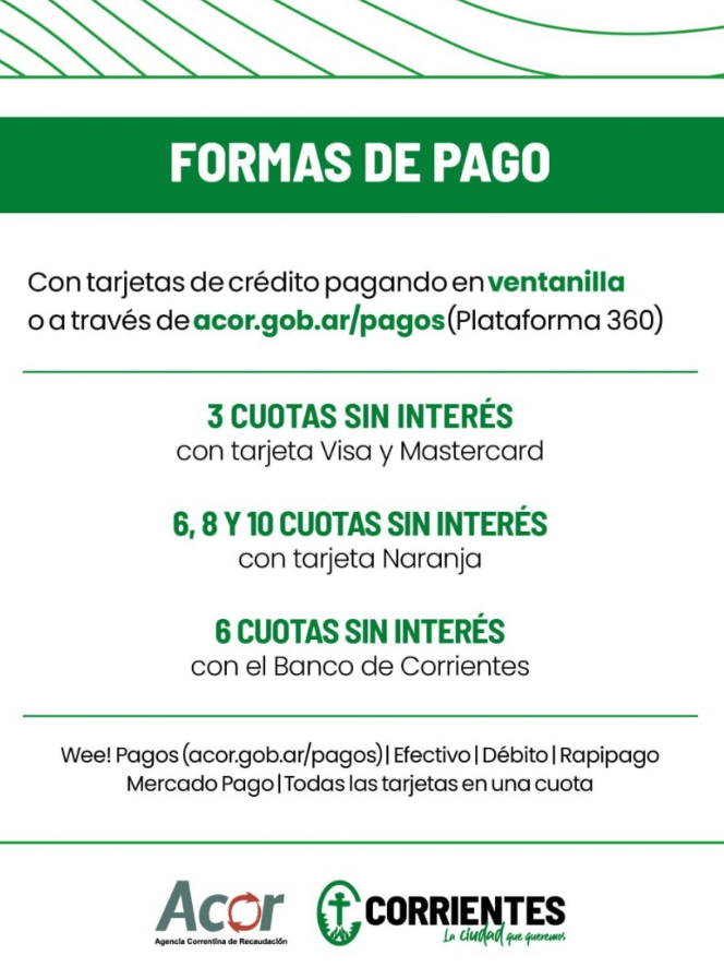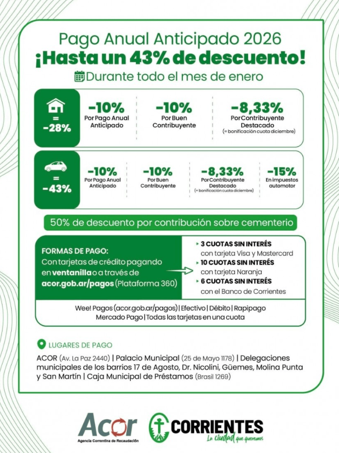 Desde la Municipalidad de Corrientes se recuerda que los que abonen de manera anticipada sus tributos podrán acceder a importantes descuentos, de hasta el 43%. Para ello, pueden conocer el estado de deuda visitando la página web: www.acor.gob.ar o de manera presencial en ACOR -avenida La Paz al 2400-, la Caja Municipal o cualquiera de las delegaciones habilitadas. Quienes adhieran, participan del sorteo de un auto 0KM.