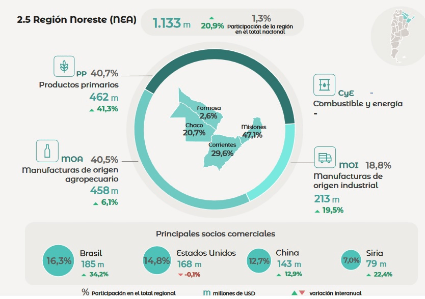 En un comparativo por provincias de cada región, además se indica que Misiones lideró la región del Nordeste, con exportaciones por 533 millones de dólares, seguida por Corrientes con 336 millones de dólares (lo que representa casi el 30% de la región), luego por Chaco con 235 millones de dólares y al final Formosa con 29 millones de dólares.
