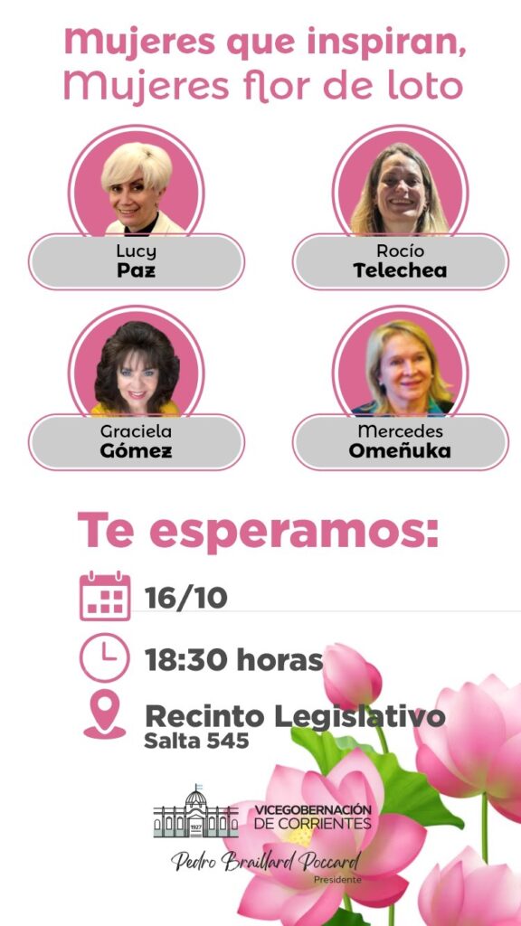 El vicegobernador Pedro Braillard Poccard invita a participar de un nuevo encuentro del ciclo “Mujeres que inspiran. Mujeres flor de loto 2025”, que se llevará a cabo el jueves 16 de octubre a las 18:30, en el recinto de la Legislatura provincial. La actividad estará coordinada por la profesora Silvia Pozo.