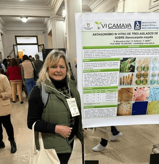 El equipo, integrado por la ingeniera agrónoma (Mgter) Celsa Noemí Balbi, la doctora Susana Gutiérrez y el estudiante Nelson Carlos Monasterio Díaz, expuso los resultados de su investigación titulada “Antagonismo in vitro de tres aislados de Trichoderma sobre Stenocarpella maydis”, un trabajo que busca alternativas naturales para controlar enfermedades en uno de los cultivos más importantes de Argentina.