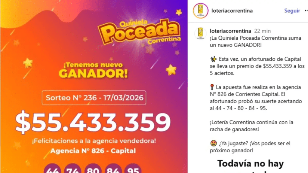 Un apostador de Corrientes Capital se consagró como el único ganador del primer premio de la Quiniela Poceada Correntina, obteniendo la suma exacta de $55.433.359. Logró acertar a los cinco números.