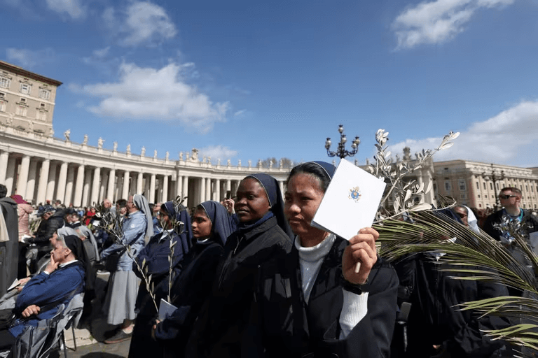 La plaza estaba engalanada con las ramas de olivo y palmas que los fieles, religiosas y miembros de la Curia habían portado en procesión antes de la misa, recordando la entrada triunfal en Jerusalén de Jesús de Nazaret.