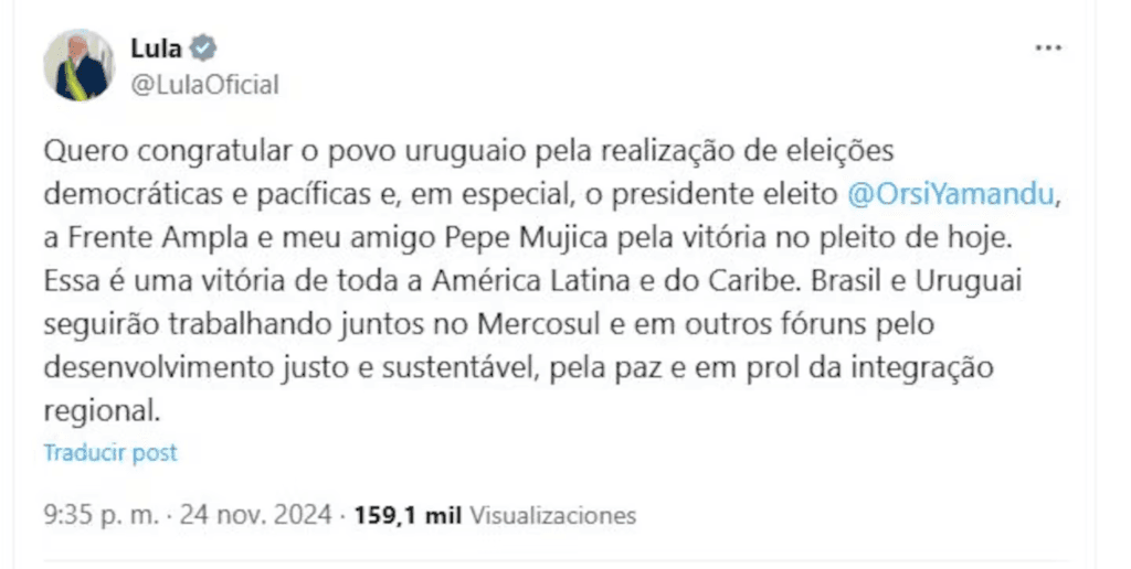 Por su parte, el presidente de Brasil, Luiz Inácio Lula Da Silva, celebró el triunfo de la izquierda en Uruguay y marcó una agenda en común. “Quiero felicitar al pueblo uruguayo por celebrar elecciones democráticas y pacíficas y, en particular, al presidente electo @OrsiYamandu, al Frente Amplio y a mi amigo Pepe Mujica por su victoria en las elecciones de hoy. Esta es una victoria para toda América Latina y el Caribe. Brasil y Uruguay seguirán trabajando juntos en el Mercosur y en otros foros por el desarrollo justo y sostenible, la paz y la integración regional”.