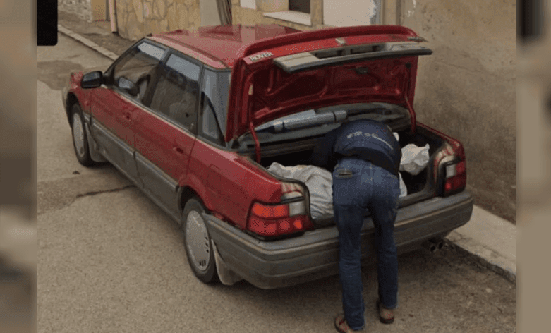 La fotografía fue tomada en el tranquilo pueblo de Tajueco, en la provincia de Soria, en octubre de 2024 y muestra a un hombre cargando un bulto sospechoso en el baúl de un coche bordó.