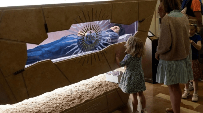 Allí fue enterrado con un molde de cera de su imagen colocado sobre su cuerpo, vestido con su sudadera, vaqueros y zapatillas deportivas y desde entonces, multitudes se congregan ante el ataúd transparente.