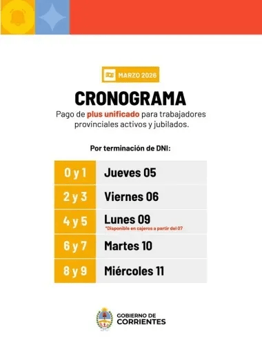 Los empleados estatales provinciales percibirán el Plus Unificado y la primera jornada de pago será para los  agentes con documentos terminados en 0 y 1. El viernes seguirá con terminados en 2 y 3. En cajeros, a partir del sábado 7 para documentos terminados en 4 y 5.