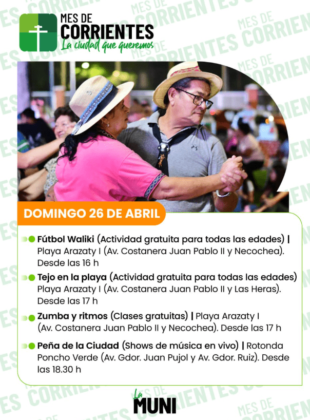La Municipalidad de Corrientes, a través de las secretarías de Turismo y Deportes, y de Cultura y Educación, presenta una nutrida agenda de actividades para disfrutar del viernes 24 al domingo 26 de abril, de propuestas deportivas, culturales, recreativas y turísticas en distintos puntos de la ciudad.