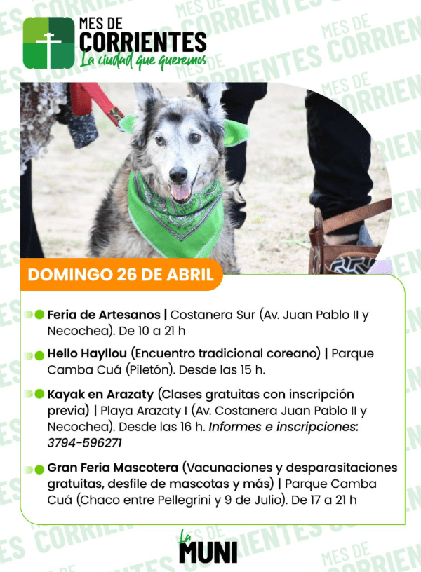 El domingo continuará la agenda con propuestas para todos los públicos. Desde las 15, se realizará el encuentro cultural coreano “Hello Hyllou” en el Parque Camba Cuá, con expresiones de música, danza, gastronomía y tradiciones del país asiático. En el mismo espacio, de 17 a 21, se llevará adelante la Gran Feria Mascotera, que incluirá vacunaciones, desparasitaciones y desfile de mascotas.