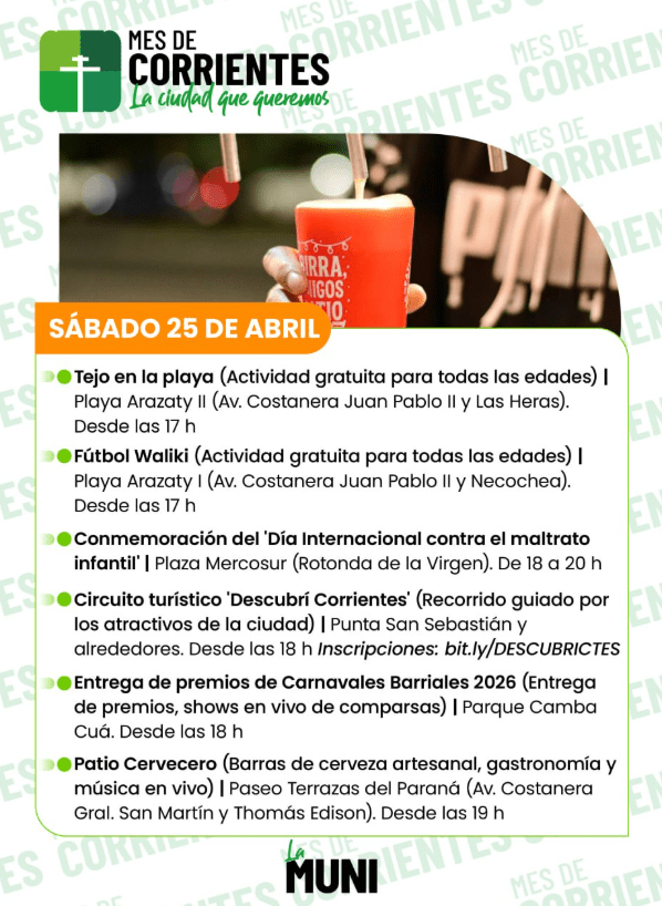 En el plano cultural y turístico, se destaca, desde las 18, el circuito guiado “Descubrí Corrientes”, un recorrido pedestre por sitios emblemáticos vinculados a la Guerra de la Triple Alianza, con inscripción previa en: bit.ly/descubrictes. Además, en el mismo horario, el Parque Camba Cuá será escenario de la entrega de premios de los Carnavales Barriales 2026, con shows en vivo de comparsas.