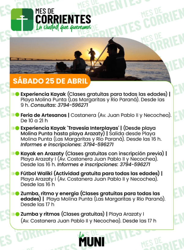 El sábado concentrará una amplia variedad de opciones. Desde la mañana, la Experiencia Kayak en playa Molina Punta brindará clases abiertas para todas las edades, desde las 9. Los interesados en participar deben inscribirse al: 3794- 635669, mientras que, por la tarde, desde las 16, se desarrollará la “Travesía Interplayas”, una actividad recreativa que une los balnearios de Molina Punta hasta Arazaty. En este caso quienes deseen participar deben hacerlo, previa inscripción al 3794- 596271.