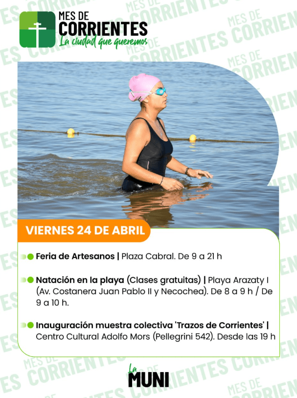 El viernes comenzará con actividades deportivas gratuitas como las clases de natación en playa Arazaty, destinadas a diferentes edades, de 8 a 10 y por la noche se inaugurará la muestra colectiva “Trazos de Corrientes” en el Centro Cultural Adolfo Mors, ubicado en Pellegrini 542, desde las 19, sumando una propuesta artística al circuito cultural de la ciudad.
