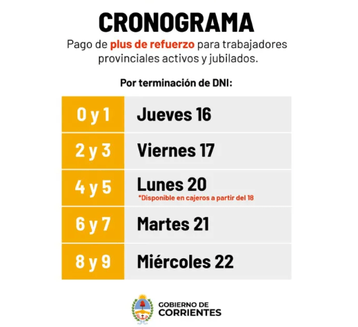 El Gobierno de Corrientes oficializó el cronograma de pago del plus de refuerzo correspondiente a abril de 2026, destinado a trabajadores provinciales activos y jubilados. La liquidación se realizará de manera escalonada, tomando como referencia la terminación del DNI, con el objetivo de ordenar la acreditación y evitar aglomeraciones en entidades bancarias.