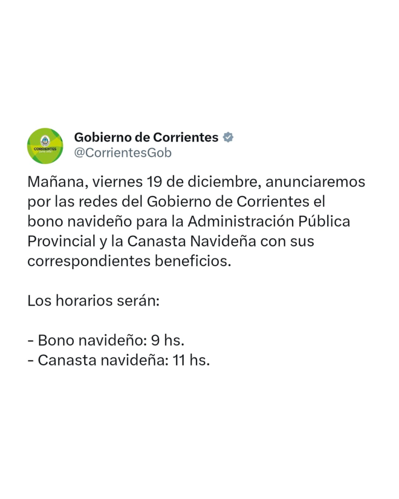Este viernes 19 de diciembre, el Gobierno de Corrientes a través de sus redes sociales oficiales a las 9 dará a conocer el bono navideño para la Administración Pública Provincial y a las 11, hará lo propio con los correspondientes beneficios de la Canasta Navideña.