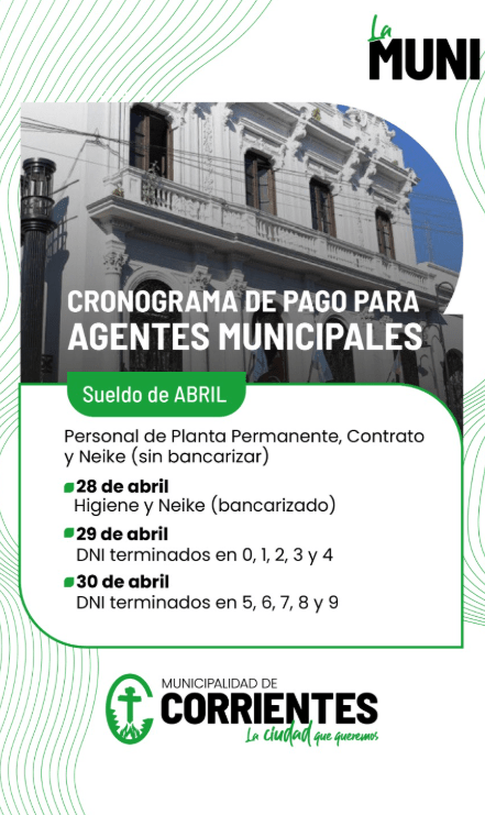 El cronograma salarial de la Municipalidad, correspondiente al mes de abril, se extenderá hasta el jueves 30 y será de manera extraordinaria en la previa al Día del Trabajador.