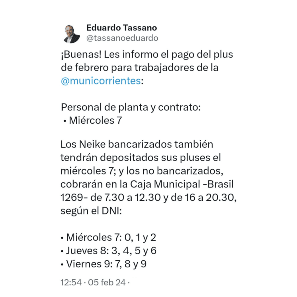 El cronograma de pago de este plus ordinario de febrero se extenderá hasta el viernes, según anunció el intendente Eduardo Tassano a través de sus redes.