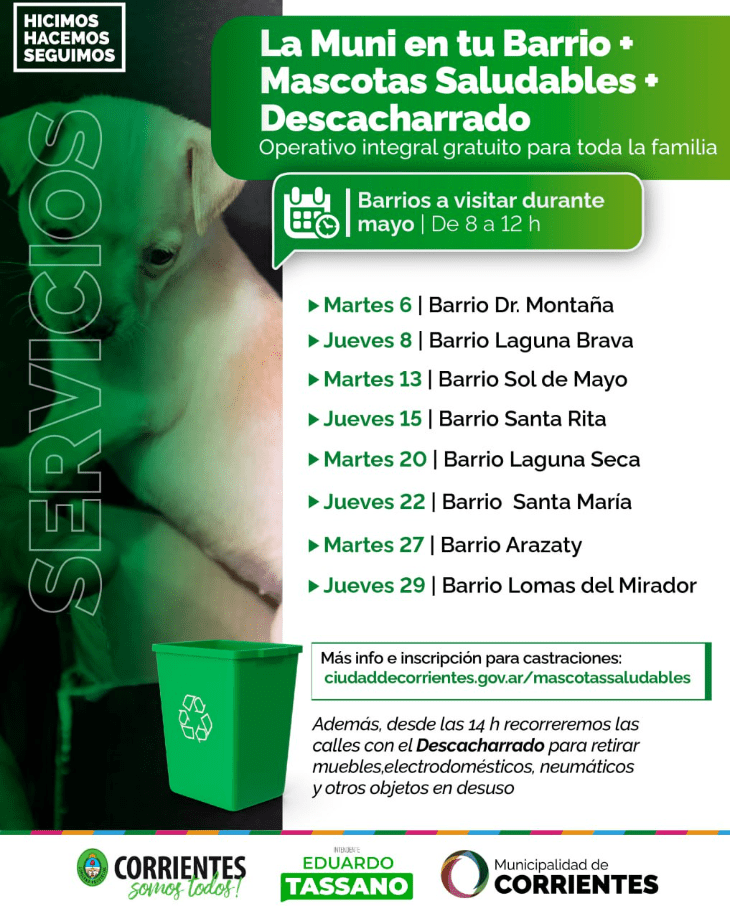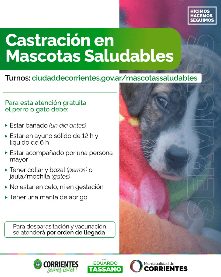 En todos los casos, La Muni en tu Barrio está acompañado del programa Mascotas Saludables, que promueve la tenencia responsable de los animales domésticos, acercando atención veterinaria gratuita, vacunación antirrábica, desparasitaciones, y esterilizaciones (castraciones). Este último servicio debe requerirse con antelación a través del turnero web (https://ciudaddecorrientes.gov.ar/mascotassaludables), por contar con un cupo limitado por cada operativo.