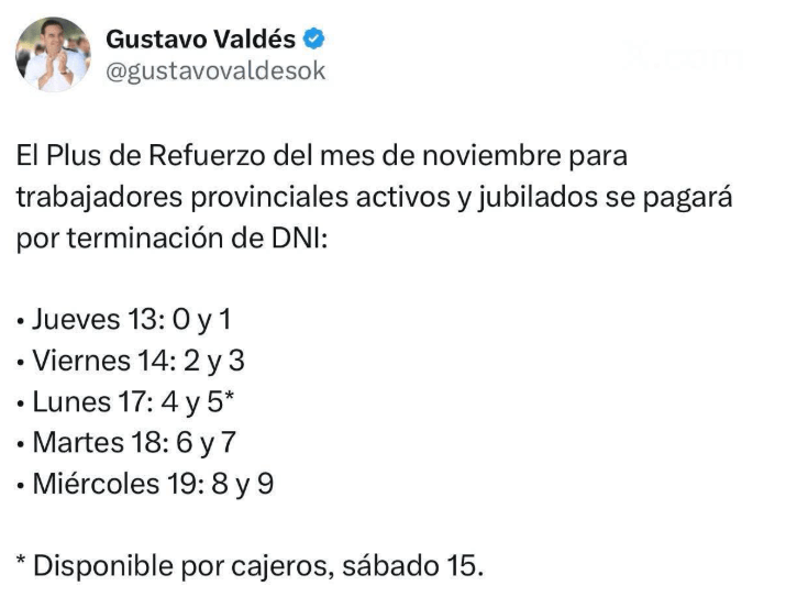 El primer Mandatario provincial Gustavo Valdés confirmó el pago del Plus de Refuerzo de $100 mil correspondiente a noviembre; el beneficio, que conforma el Ingreso Salarial Mensual, alcanza a los agentes de la administración pública provincial, activos, jubilados y pensionados. Comienza este jueves 13 y se extiende hasta el miércoles 19, inclusive.