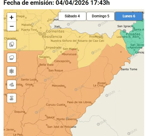 El panorama se tornará más complejo hacia el lunes, cuando gran parte de la provincia quede bajo alerta naranja. Comprendido por Concepción, Curuzú Cuatiá, Mercedes, San Roque, Sauce, General Alvear, Paso de los Libres, San Martín, Santo Tomé, Bella Vista, Esquina, Goya y Lavalle. Por lo que se prevén tormentas fuertes e incluso localmente severas, con condiciones que podrían generar un mayor impacto.